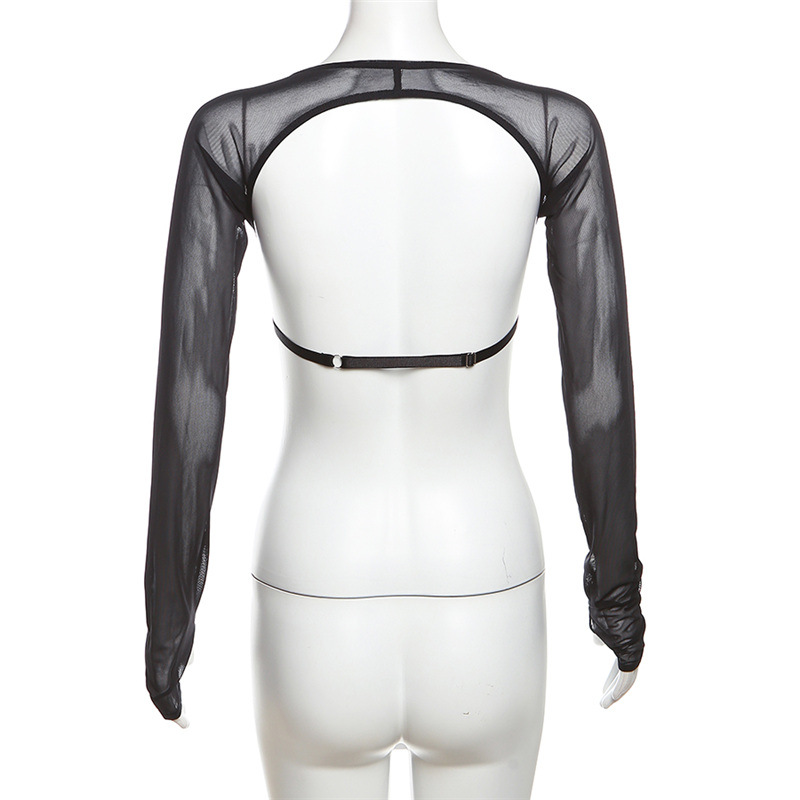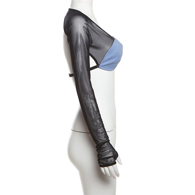 Autumn Women Clothing Long Sleeve V neck Slim Mesh Stitching Cropped Top