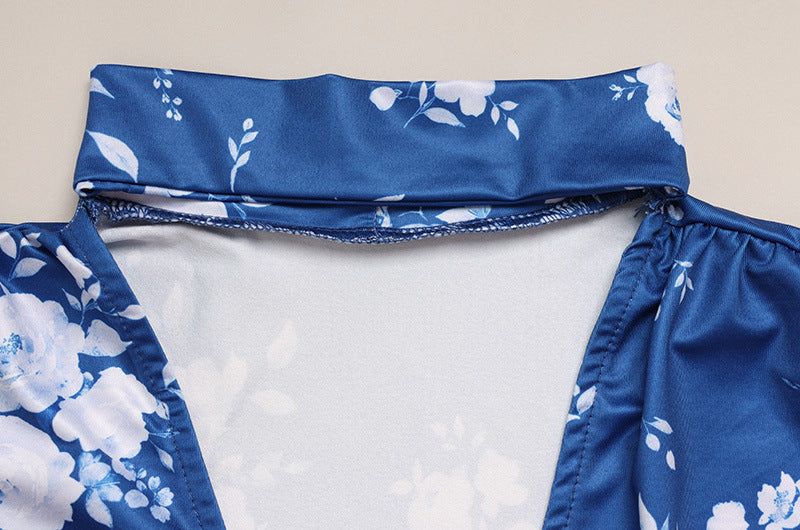 Floral Print Elegant V neck Summer Slim Fit Lightweight Thin Long Sleeve Dress Klein Blue Dress