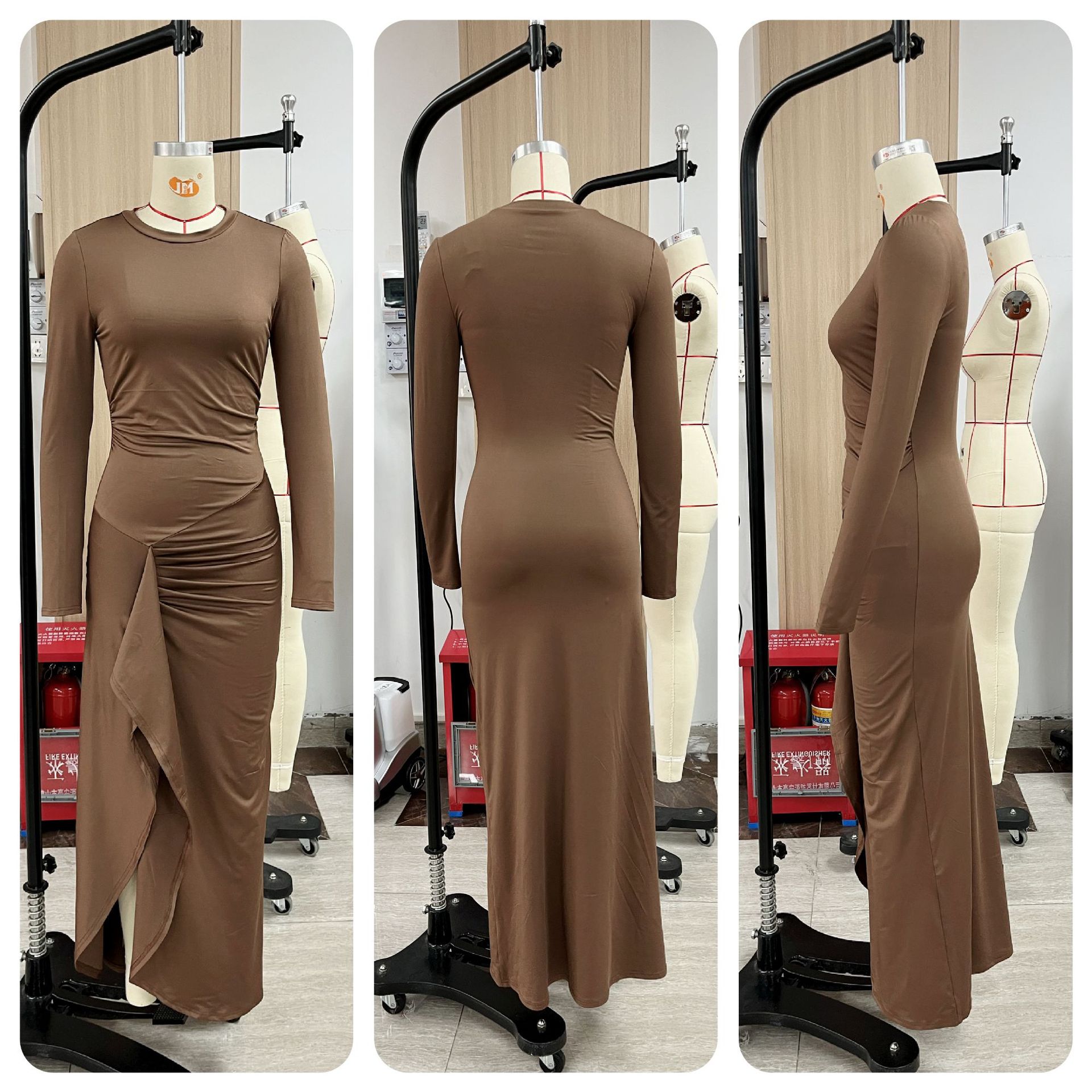 Women Clothing Arrival Autumn Winter Solid Color Fashionable with Side Slit Dress Evening Maxi Dress