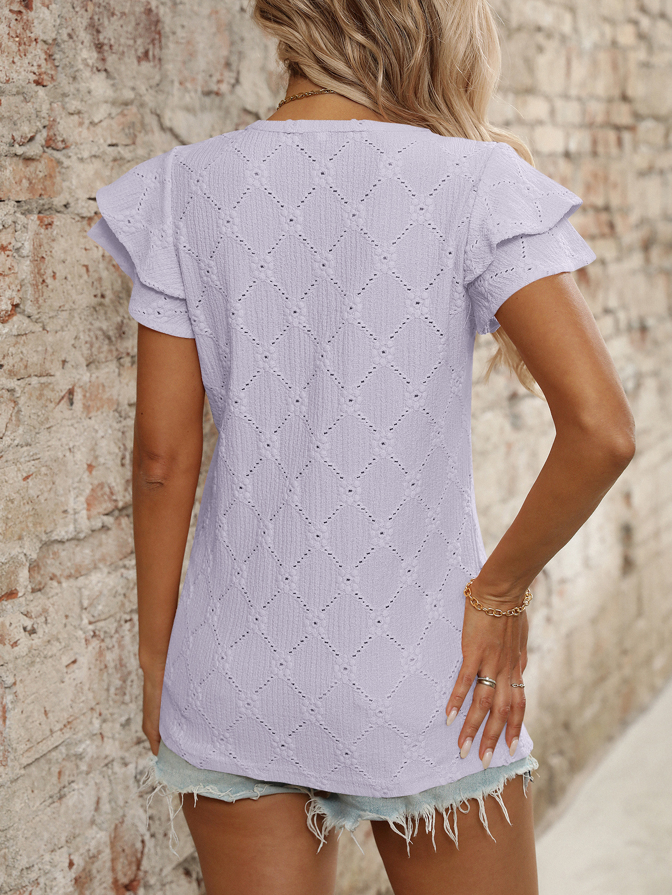 Women Clothing Spring Summer Solid Color V neck Sweet Short Sleeved T shirt Hollow Out Cutout Top